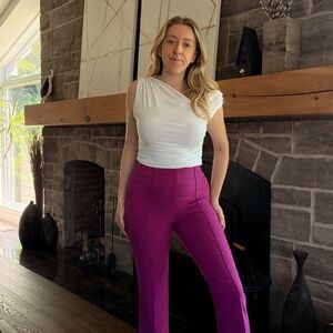 Add a bold pop of color to your wardrobe with these fuchsia flare pants! Featuring a comfortable elastic waist with a side seam zipper for easy wear, these pants offer a flattering fit with just the right amount of stretch. The flared hem includes stylish slits for added movement and a touch of flair, perfect for dressing up or down for any occasion.