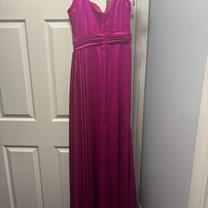 Beautiful vibrant fuchsia gown with a structured beaded bodice, floral appliqué strap detail and a draped satin skirt. Perfect for prom, weddings or formal events. Excellent condition.