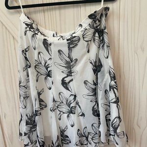 Le Chateau skirt - 9/10 easy maintenance and looks beautiful. Lined and easy maintenance. Very pretty with black tank. The colour is slightly off white adding an elegant look. Super cute with heels as it hits mid length thigh. 100% polyester for easy care.