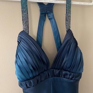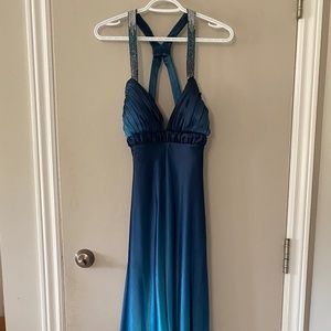 Elegant full length gown by Jolie. Ombre dark blue to light blue dress with beautiful beaded cross back straps detail and plunging open back. Only worn once, two scratches on the dress (pictures included).