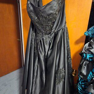 This gown is full length with tulle layers underneath. It has spaghetti straps and corset lacing up the back. The embroidery detail is gorgeous. The material is quality and holds it's shape nicely.