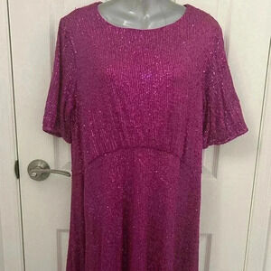 This dress is all over pink sequins. Gorgeous and flattering cut, goes to above ankles. Dress is very stretchy, polyester material. Listed as Size 14, I wore it at a size 18 comfortably, but of course it will depend on the body type. Please pay attention to measurements in pictures. Elastic sleeves shown up close in picture. There are several pulls on the dress from the sequins. It was purchased on clearance that way (probably why it was on clearance) and price reflect this. I tried my best to show the pulls and where sequins are loose. These defects are not particularly noticeable unless you are inspecting the dress. Worn once for a New Year’s Eve party. Such a vibrant, beautiful colour. 20” pit to pit and 18” across the seam under the bust. Dress is very stretchy though.