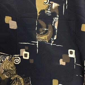 Fulton Street Shirt Works Top. Men's Size 1X. Black and tan abstract print. Banded hem. 4 Button collar. Patch pocket. Tony Soprano / Mobster style shirt.