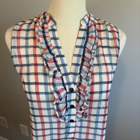 This very cute Fun 2 Fun, sleeveless plaid top is a must have for summer. A very cute V-neck with buttons and a ruffle along with a semi-sheer design. Made with 100% polyester, hand wash this close and hang to dry. There are no snags, stains or tears, this blouse is in very good condition.