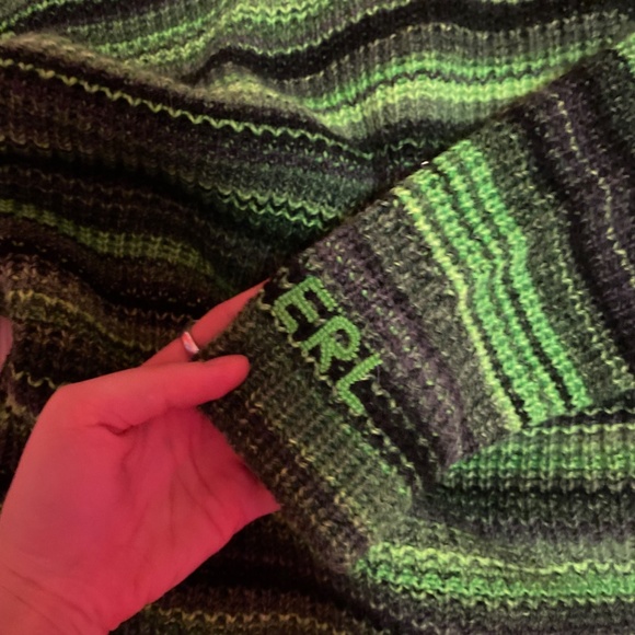 100% virgin wool ERL designer sweater with embroidered V I R G I N letters on back of sweater. I'm not sure of the size but fits slouchy, I wore it as a sweater dress. Excellent condition. Retailed for around $800.