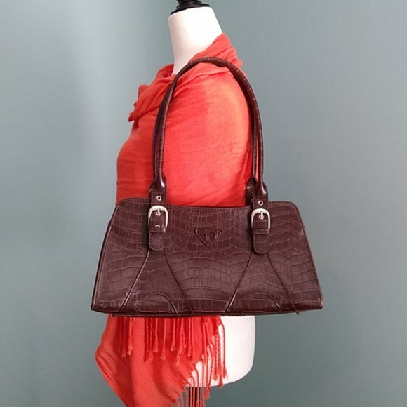 Cute and fun faux Prada handbag in good condition. Prada "decal" on front is missing. Inside lining is in great condition--clean, no rips or tears. Outside in great condition also. Colour is a deep maroon.