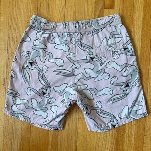 bunny print, pastel pink, lightweight, elastic waist, cartoon character, all-over pattern, casual shorts, pop culture, novelty design, fun summer