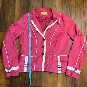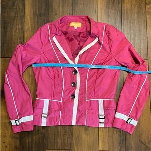 This fun, bright pink jacket will make an excellent addition to liven up your wardrobe. European styling with buckle details at the hem and cuffs. Quality construction.