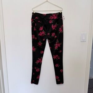 Stylish black leggings with vibrant red floral pattern. Perfect for casual wear.