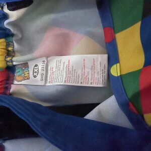 Vibrant multi-colour clown dress with classic circus patterns (polka dots + diamond print)