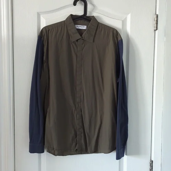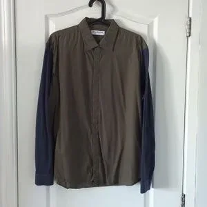 body is khaki green button down with hidden buttons. sleeves are a navy blue cotton.