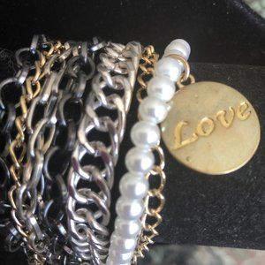This cute bracelet has 6 different chains and one strand of pearls, with an adorable "love" charm. Easy fastening with "lobster claw"