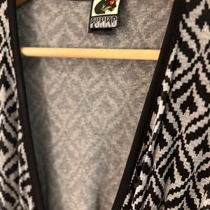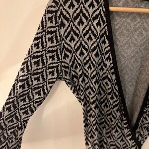Elegant black and white wrap dress with a striking geometric pattern. Perfect for any occasion.