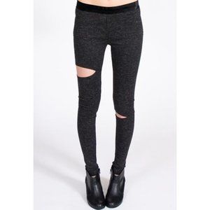 A deep, dark heather grey skinny legging with cut-outs on the side of each leg and secured at the top with a velvet elastic waistband. Super soft and comfortable while looking absolutely killer.