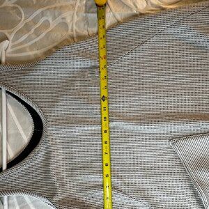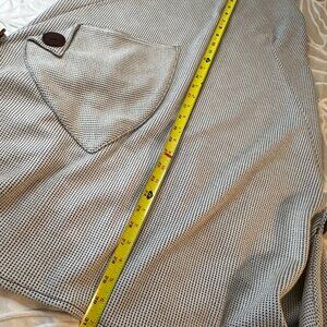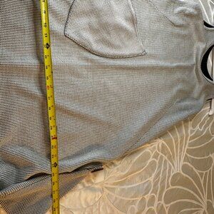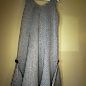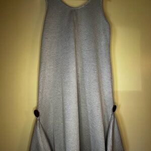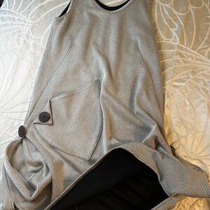 The comfy, funky Asymmetrical dress is full of fun accents. Fabric is a heavier blend that can be warn in the spring, fall and winter months. A fun piece features an off set pocket, with fun large buttons made of leather. This dress is a sure conversation piece at a get together! Soft grey with weaved black thread through the entire dress. As comfy as a sweat suit but so cute you can go to a party in! No size or tag but a small or medium fit for sure.