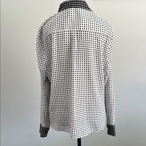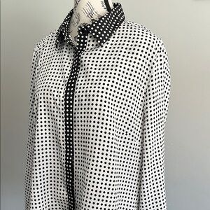 Stylish shirt featuring a classic black and white polka dot design. Perfect for both casual and formal occasions.