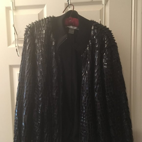 For sale is a black bomber jacket with vinyl and fur detail. I purchased this with the intention to lose weight to wear it, but that never happened and it has been sitting in my closet. It's new and is a piece that will give the wearer that edgy look. Size 18.