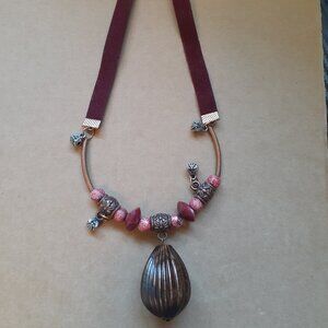 Preowned and good condition. I always liked wearing this quirky, playful necklace. It dresses up any plain shirt or pullover with a good dose of whimsy! Hanging from a deep maroon red velvet ribbon is an assortment of glittery pink beads and deep red beads. There are some silver tone accent beads and some brass detailing. Hanging in the centre is one large rounded bead that almost has a wooden quality to it (I'm not sure what the actual material is). The necklace is 19 inches in length. The centre bead is about 1.5 inches in length.