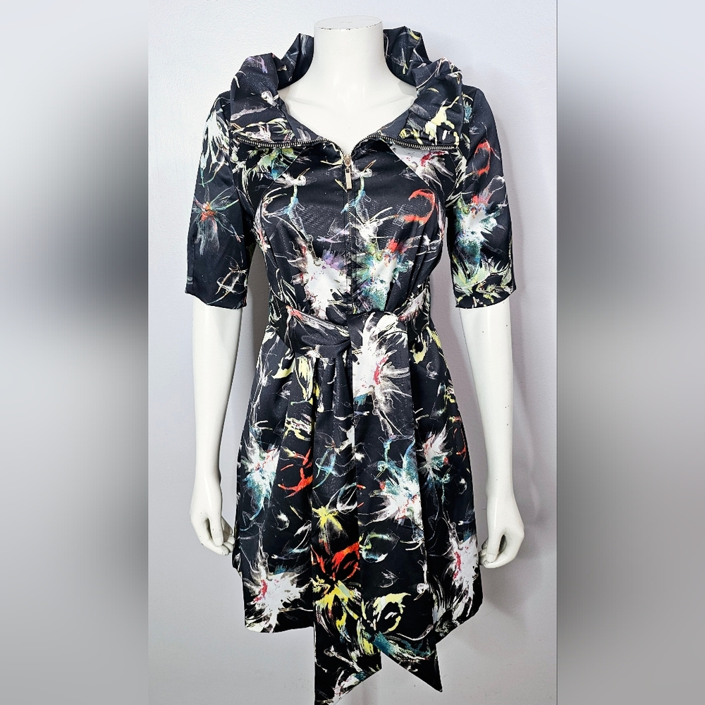 Super funky "firework print" Spring jacket. Dramatic collar, half sleeves, cool gathered seams.
