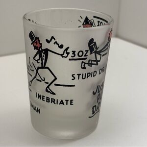 Funny vintage Federal Glass 4 ounce shot glass with painted characters. Add a touch of humor to your vintage barware collection with this 'Just Plain Drunk' glass, featuring different characters for each ounce measurement. It’s in amazing condition with no damage or wear to the paint, and is free of chips and cracks.