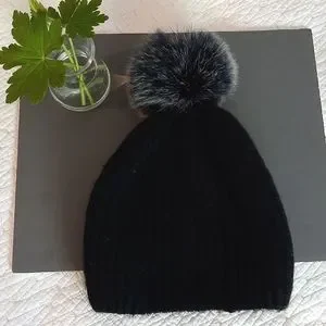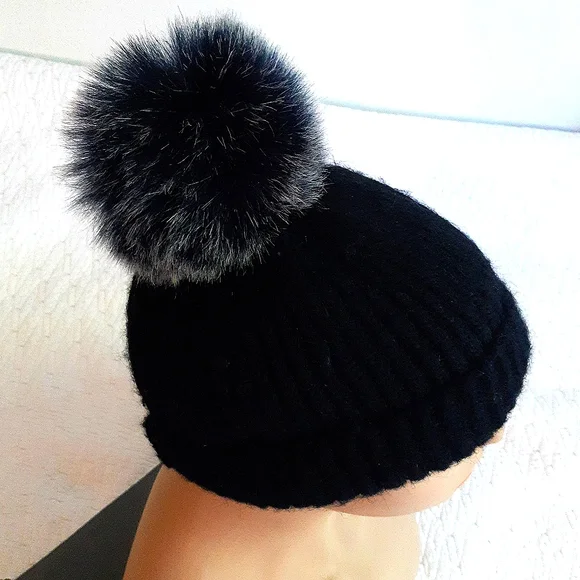 Fur pompom on a knitted hat.