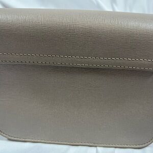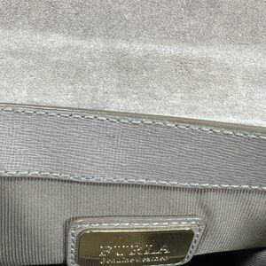 This sophisticated Furla crossbody bag in a chic gray hue boasts a structured design, complemented by a sleek metallic clasp and a stylish chain strap. Its compact size makes it an ideal choice for both formal and evening occasions, offering a blend of elegance and functionality.