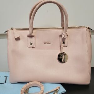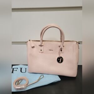 Elegant and stylish, this Furla handbag in a soft pink hue is perfect for any occasion. Crafted with high-quality leather, it offers both durability and sophistication. Ideal for adding a touch of color to your ensemble.