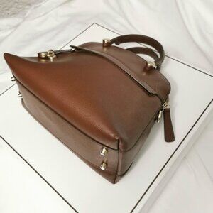 Furla Piper small dome satchel in cognac pebbled leather. No original strap, but a generic strap will be provided for use as a short shoulder strap. The lock is missing its key. There is mild wear on the corners, but it is not very noticeable.