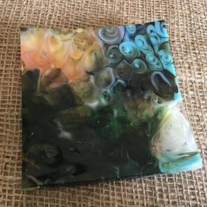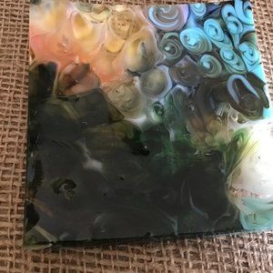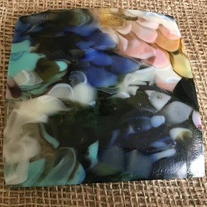 Kiln formed fused glass, 4.25" square and slumped into a sushi-style mold making it about 3/4" high at the corners.
