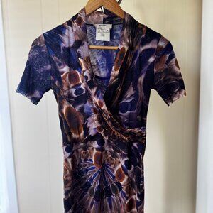 Size S. This mesh wrap style top has a built-in indigo shell, so no tank top needed. Stretchy and form fitting, it fits under a blazer but is also nice with a pair of jeans. 100% Poliamide nylon