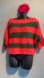 One of a kind hand knitted sweater made of very soft fuzzy yarn. Very stylish and cozy, vibrant striped design. Scallop trim on the neck, bottom and sleeves. Boat neck and 3/4 batwing sleeves. Featuring bold coral and green colors.