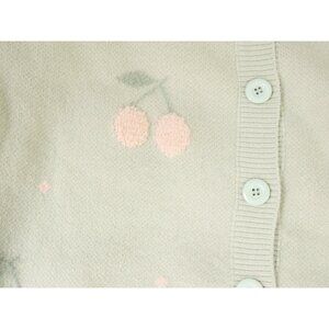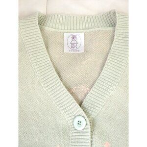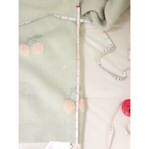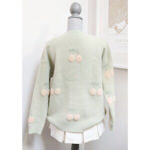 The coziest long sleeve v neck sweater, perfect for curling up and reading a good book to. Kitsch 3D off-white cherry pattern knitted into the pastel mint green fabric all over the front, back and sleeves. Oversized buttons. Original tags attached.