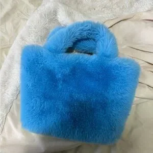 a fluffy, soft tote bag with a vibrant and playful design. The bag is primarily blue with a bright green base, depicting a landscape scene with fluffy white clouds in the sky and green hills at the bottom. The material appears to be a plush or faux fur fabric, giving the bag a cozy and whimsical feel. The overall design is cheerful and eye-catching, evoking a serene, cartoon-like outdoor scene, making it both a stylish and fun accessory.