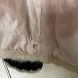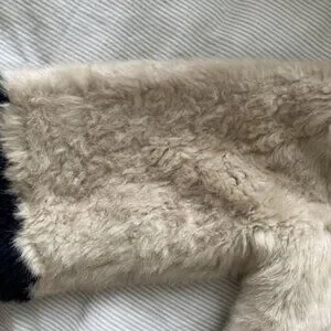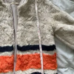 Beige coloured furry jacket, with orange and navy blue stripes. One hook at the top of the neck. I always get compliments when I wear this, but it's slightly too tight in the shoulders for me. Some wear on the fake fur (photos show slight damage just above navy stripe on the arm and the slightly matted fur on the sleeve. Small holes in the lining (pictured). Price reflects this.