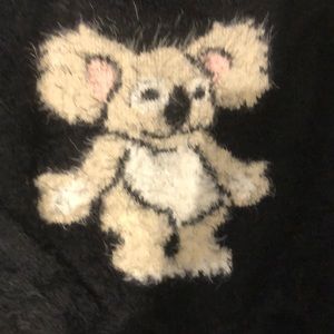 Solid black fuzzy sweater with a koala bear on the front. This sweater is so soft! Pull over crew neck style. Gently worn. Smoke free and pet free home.