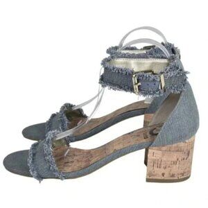 G By Guess Frayed Denim Sandal Heel Chunky Cork Heel Open Toe Size 8.5