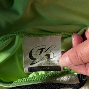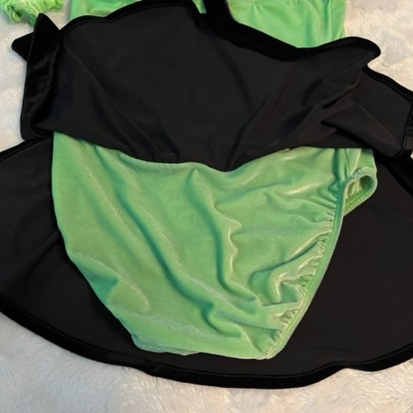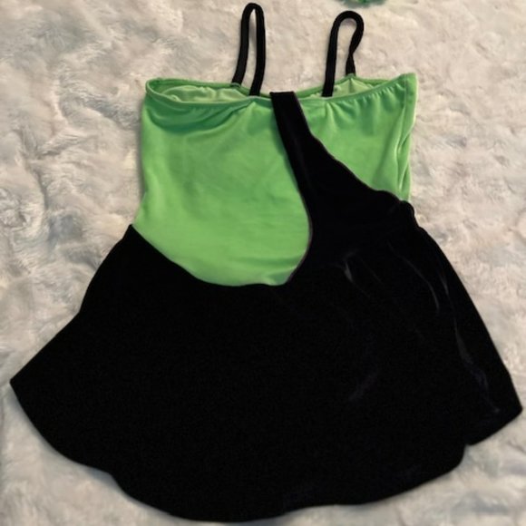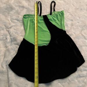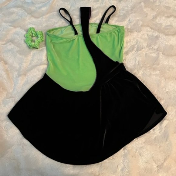 G K Elite Sportswear Figure Skating Dance Outfit brand new without tags. Green and black in colour, with spaghetti straps and matching green hair scrunchie. Soft velour made of 72% acetate, 19% nylon and 9% spandex. Machine wash cold gentle cycle. Made in USA. Colour depends on device/screen settings and lighting in pictures.