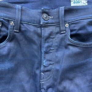 The 3301 features a five-pocket construction, concealed button closure, and back logo label.