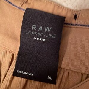 Features front button closure, an draw string "waist" in a slightly stretchy sheath that sits on the hips. The shorts part has a button front and zipper closure as shown.
