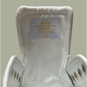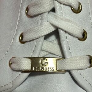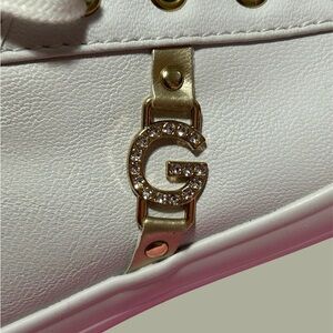 - Faux leather sneakers featuring gold metallic details and rhinestone G logo on side