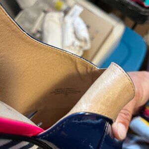 Paton leather with cloth wedge. Royal blue, white, and pink in color.