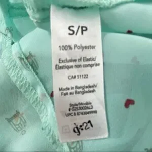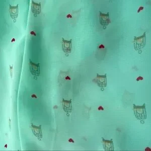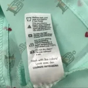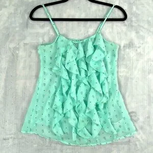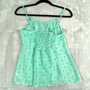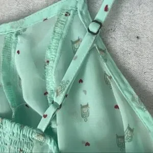 Women’s Size Small. Mint green with bird cage and heart print. Five ruffles in front. Filmy material. Elastic back. Adjustable spaghetti straps.