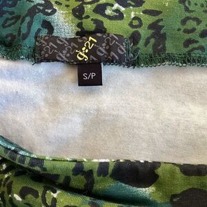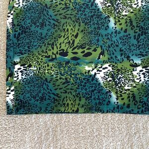 Green and blue animal print mini, cotton spandex, EUC, waist 14” side to side, hip side to side 15”, length 16”.