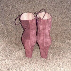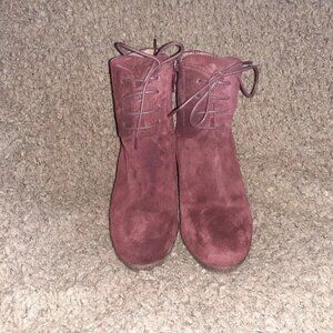 Made in Spain, these plum colored ankle booties have a decorative/adjustable lace-up front and a size zip.