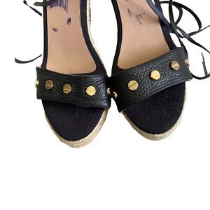 GAIMO Black Leather Wedge Espadrilles Sandals Gold Studs Ankle Tie Straps 40