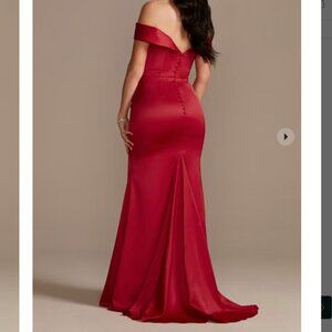 This stunning satin off-the-shoulder mermaid bridesmaid dress from David's Bridal is the perfect choice for any bridal party. The off-the-shoulder neckline adds a touch of elegance, while the mermaid silhouette is flattering on all body types. The satin fabric drapes beautifully and has a luxurious feel. Whether you're a bridesmaid or a guest at a formal event, this dress is sure to turn heads. This stretch-satin mermaid bridesmaid dress features an off-the-shoulder sweetheart neckline, flattering side-ruching, back buttons, and a fishtail train.