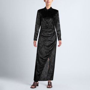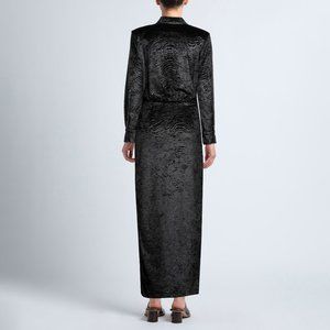 Velvet brocade, brand logo, polka-dot, classic neckline, long sleeves, unlined, button closing, no pockets, stretch, shirt dress, thin shoulder pads.