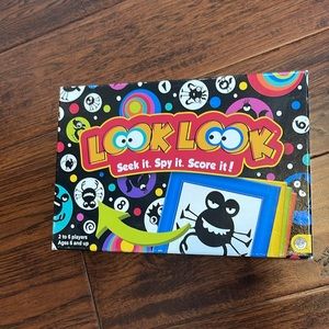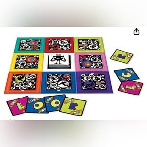 Crazy creatures abound in this fast-paced, mixed-up matching race! Draw a card to reveal the challenge. Will you need to find the identical creatures within two differently colored frames, or do quick math once you spot the numbers? Race against your opponents to spot it or solve it. The winner keeps the card. Be the first to collect enough cards to spell βLook Look,β and you take the game! Game board is comprised of eight interchangeable frames, making it a new game every time you play. Includes 68 challenge cards. 2 or more players.