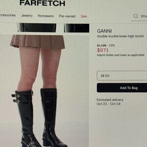 Bought September 2024 from GANNI store in London, UK, as can be seen in photo of emailed receipt. Only worn three or four times. There are some scuffs on the heels (see photos). Included in photos is a screenshot of Farfetch website where they still have a new pair of the same size available for $971US before duties and import tax. Size is 38EU and fits like a size 7.5 - 8.