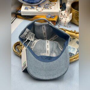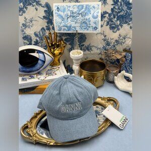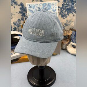 🆕 GANNI 🧿 NWT White Logo Embroidered Blue Denim Baseball Cap, Woman's Hat
